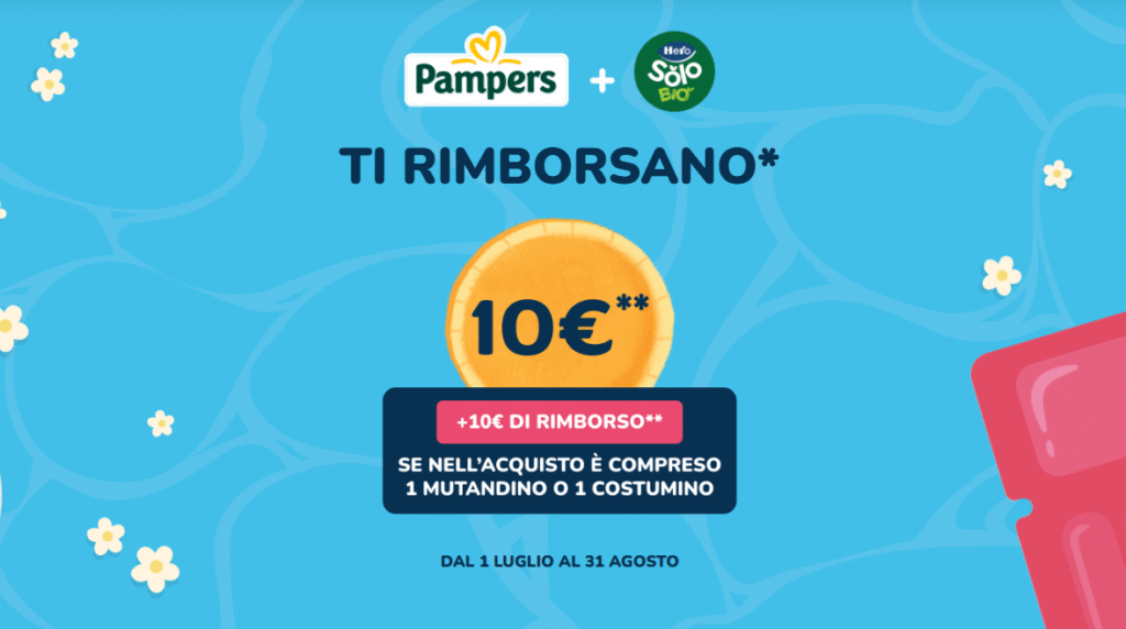 • 10 € di cashback a fronte di una spesa minima di 38 € in prodotti Pampers e/o Hero Solo.