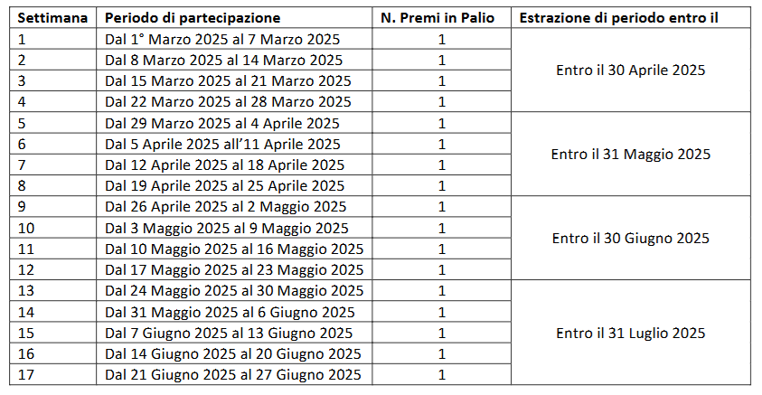 Sarà possibile partecipare dal 1° Marzo 2025 al 27 Giugno 2025 all’interno dei Periodi di partecipazione indicati a seguire per partecipare alle estrazioni di periodo:
