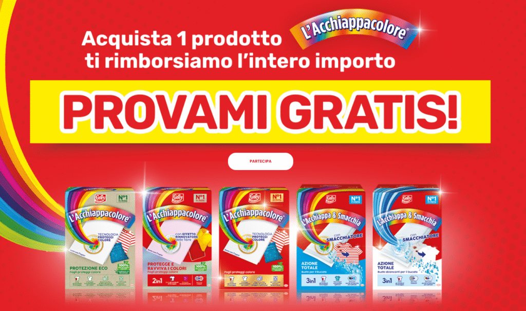 Acquistando un qualsiasi prodotto Henkel L’Acchiappacolore con un unico scontrino parlante, è possibile richiedere un cashback del 100% dell’importo speso.