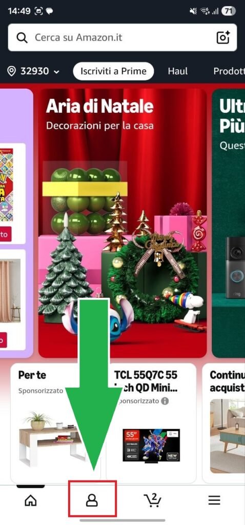 Apri l’app Amazon sul tuo telefono (disponibile sia per iPhone che Android). Se non l’hai ancora installata, clicca qui per scaricarla. Una volta aperta, effettua il login con le tue credenziali Amazon se non sei ancora collegato. Sulla schermata principale dell’app detta anche homepage, clicca sull’omino come indicato sullo screen.